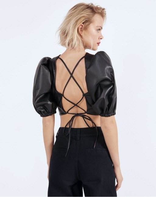 Faux leather blouse with voluminous sleeves